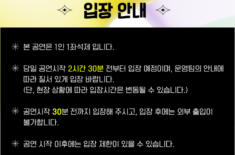 공연 당일 혼잡할 수 있으니, 여유 있게 도착하시기 바랍니다.